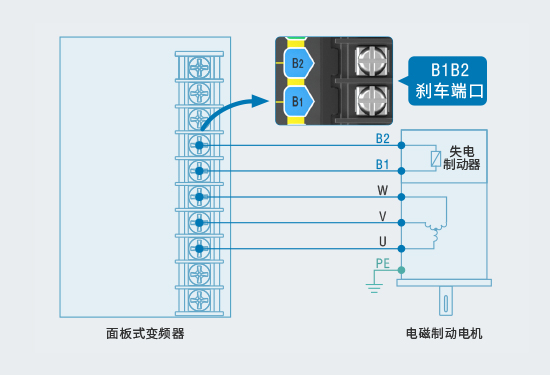 標配電磁制動電機 B1B2 剎車端口,無需復雜的接線和調(diào)試即可控制電磁制動電機,接線簡單,所有煩惱一次解決。