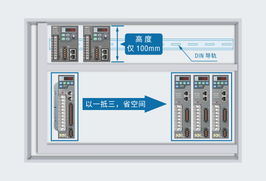 導(dǎo)軌式變頻器高度僅 100mm,可通過(guò) DIN 導(dǎo)軌安裝,面板式變頻器可直接外置安裝。